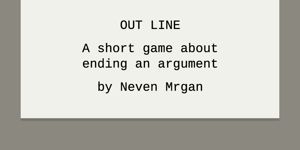 I’ve toyed around with games/stories written in Twine for a while, but it’s been easy to bite off way more than I can chew. To actually finish a Twine project, I fished out this old idea. It’s based on a notion that has occurred to me regarding zen koans: often, they end in a way that declares the master or the student or another student the “winner” of the argument merely by giving them the last line. This happens in movies and TV shows as well, since they’re so dependent on cuts: if someone delivers a sharp line and we cut away, the feeling is that they’ve been victorious in the scene. In real life, it doesn’t really work out that way—the other person likely has a comeback, and arguments tend to simmer and bubble and eventually cool off.
