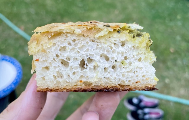Oil your 9 × 13 pan thoroughly, brushing to cover every spot; a nonstick aluminum pan will work well. Once the dough is more than doubled, puffy and light, gently scrape it into the middle of the oiled pan. Oil the top of the dough a little and spread the dough to the corners a bit; you still want to use gentle movements, but make sure you’re covering at least 70% of your pan with dough, and get it even-ish in thickness. With a wet, airy dough like this, you don’t want to beat it up. That said, the time to stretch it is now and not later after it’s even more gassy.